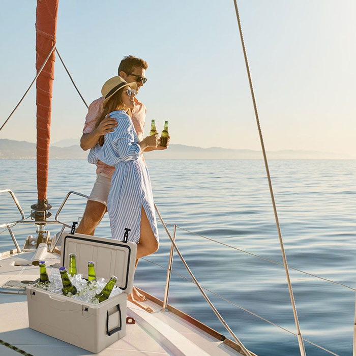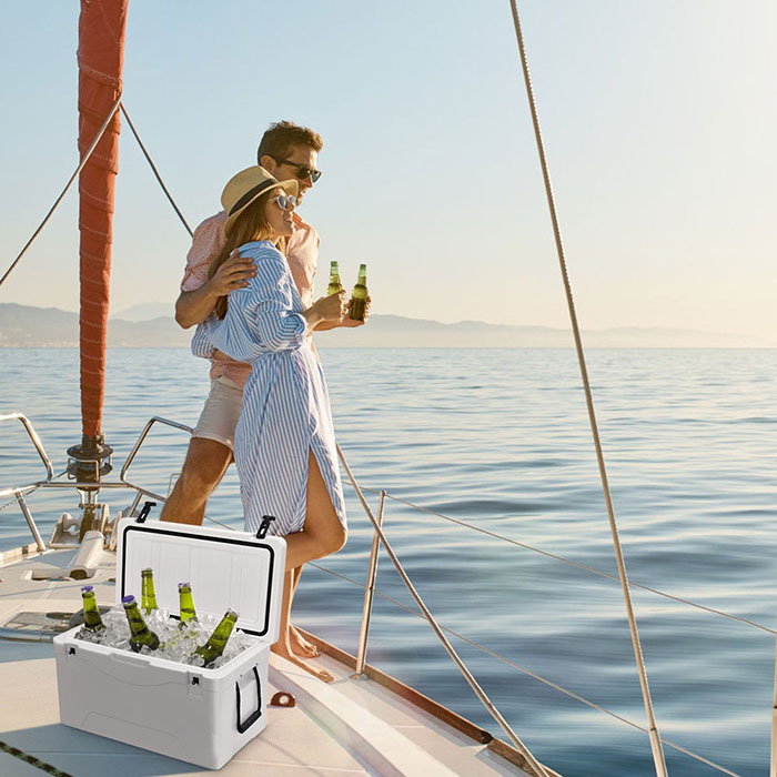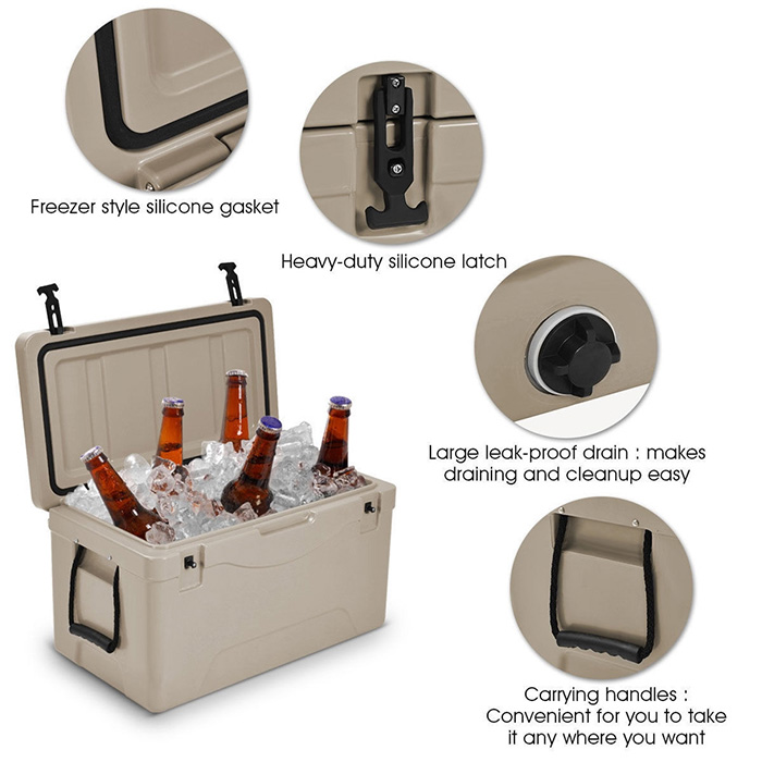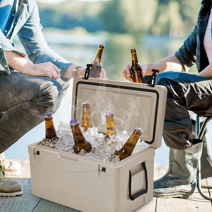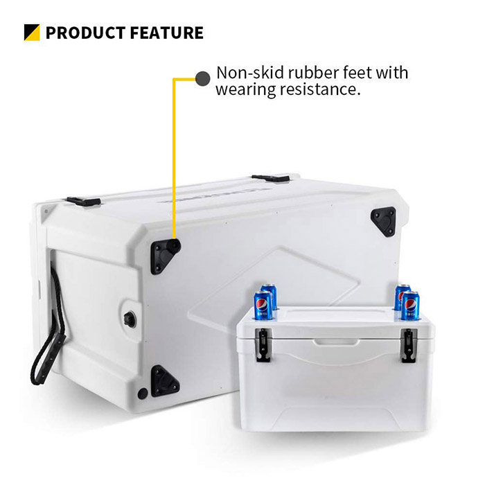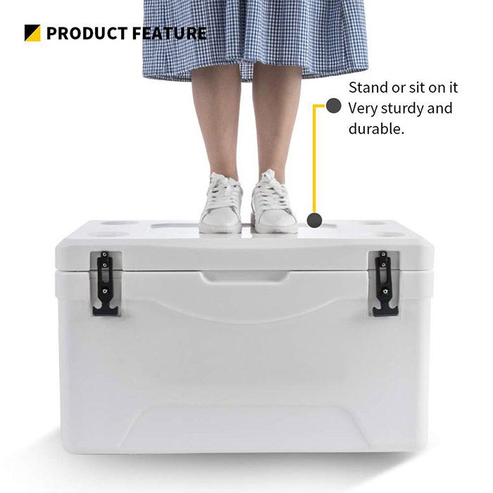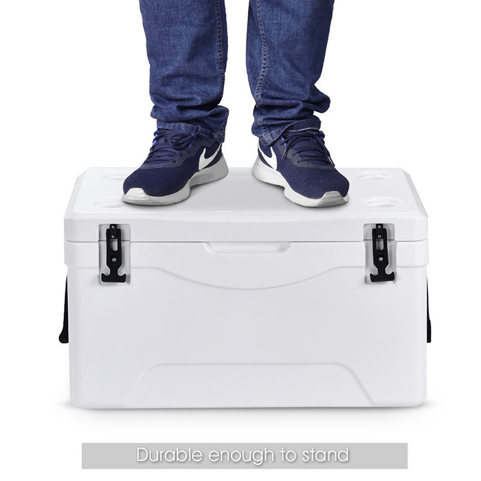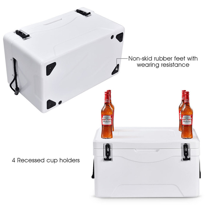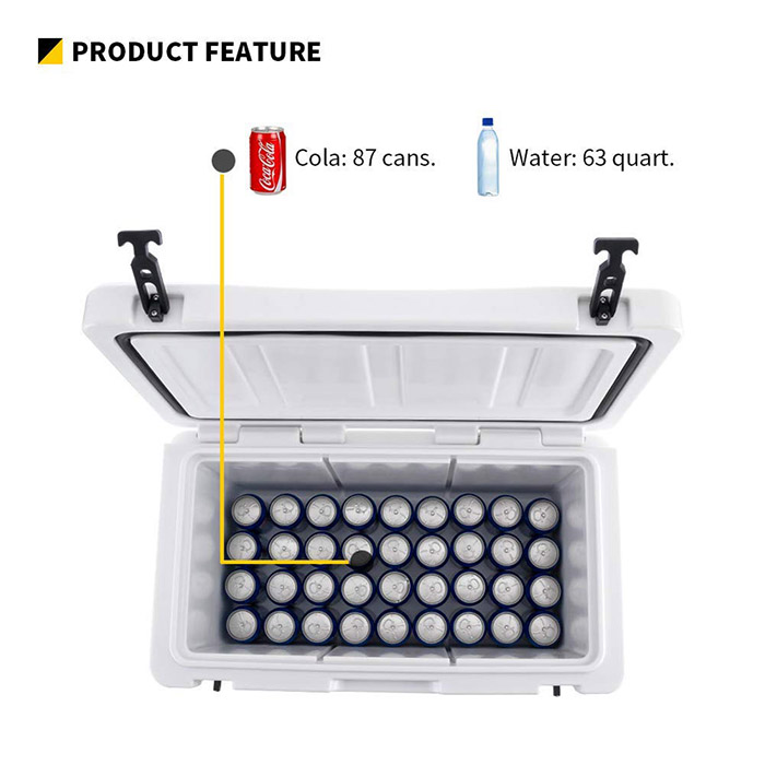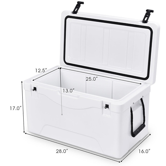 Our insulated 64 quart cooler is of high quality. It has compact white appearance. Made of reliable LLPDE and PU Foamed-Filled insulation materials, this cooler is really useful and practical. It can keep your food and drinks cold for an extended time, and make the fun last longer. It can retain the ice up to eleven days! With 64 quart capacity, it provides enough space for you to store your foods, beverages and other things to eat. This cooler is also portable. It is very convenient for you to use. This cooler can keep your cold drink close while you enjoy the day.