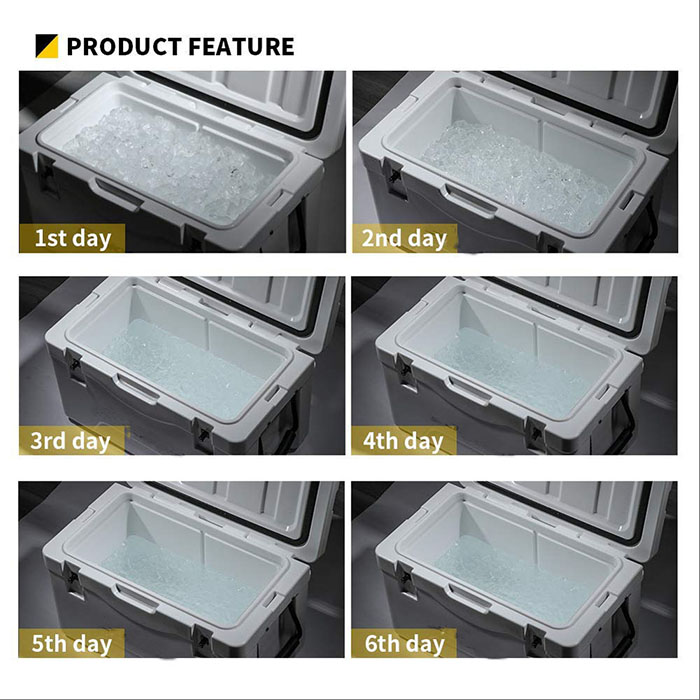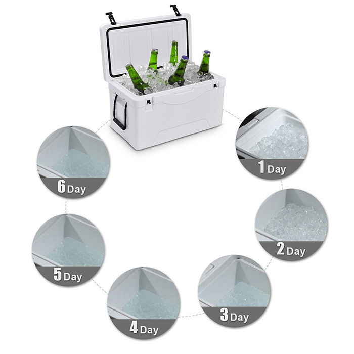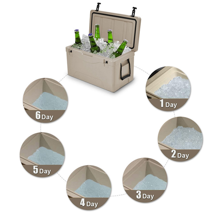 This Cooler is perfect for you to do picnicking, camping, fishing, family outing, boating, hunting, driving, and other outdoor activities. When the cooler in outside FULL with ice, will keep 5 to 7 days under 77℉. Above 100℉, ice will stay about 3days.